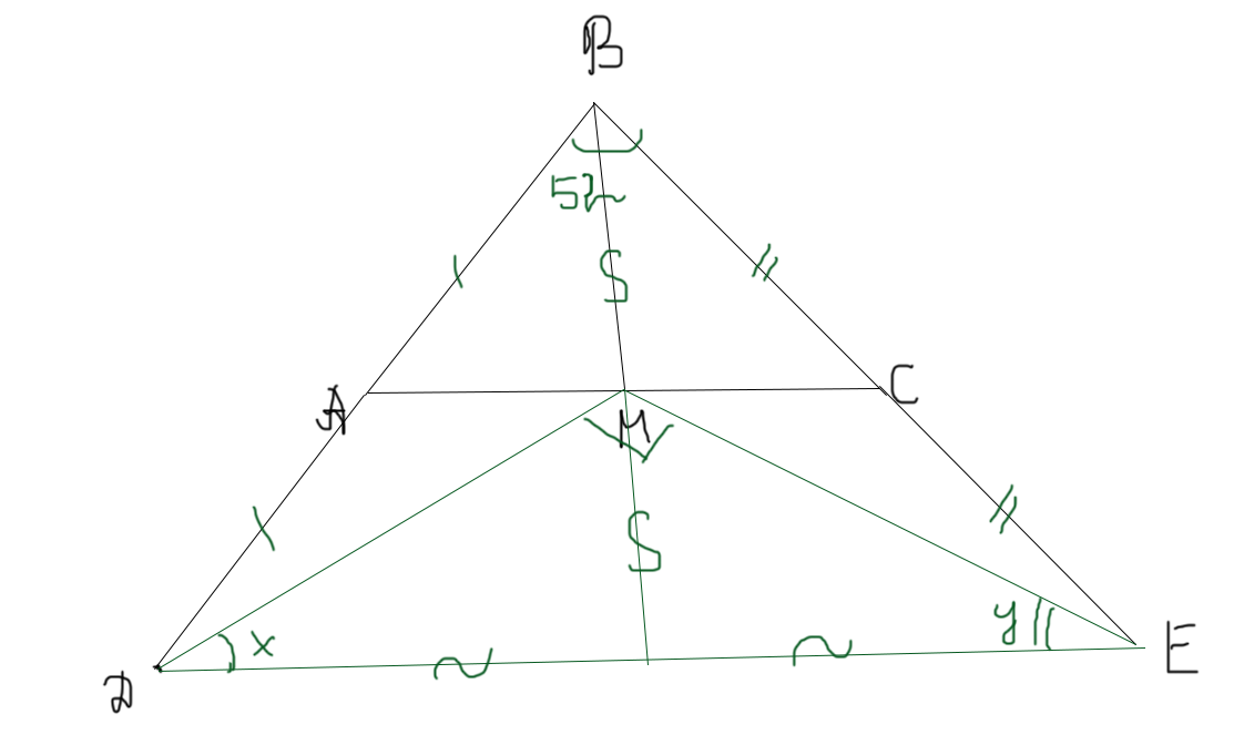 В треугольнике ABC медиана BM равна стороне AC. На продолжениях сторон BA и BC за точки A и C соответственно выбраны точки D и E такие, что AD=AB и CE=BC. Известно, что ∠ABC=52∘. Найдите ∠ADM+∠CEM. Если мы поддадимся соблазну и соединим D и Е, то АС станет средней линией ДВЕ. Продлив ВМ на свою длину мы получим медиану е ДЕ. Теперь в треугольнике ДМЕ медиана из вершины М равна половине ДЕ, значить ДМЕ прямоугольный и сумма углов х и у = 90 Чтобы ответить на вопрос задачи, нужно из суммы углов Д и Е вычесть сумму х и у 180-52-90=38 Ответ 38 Другие задачи раздела