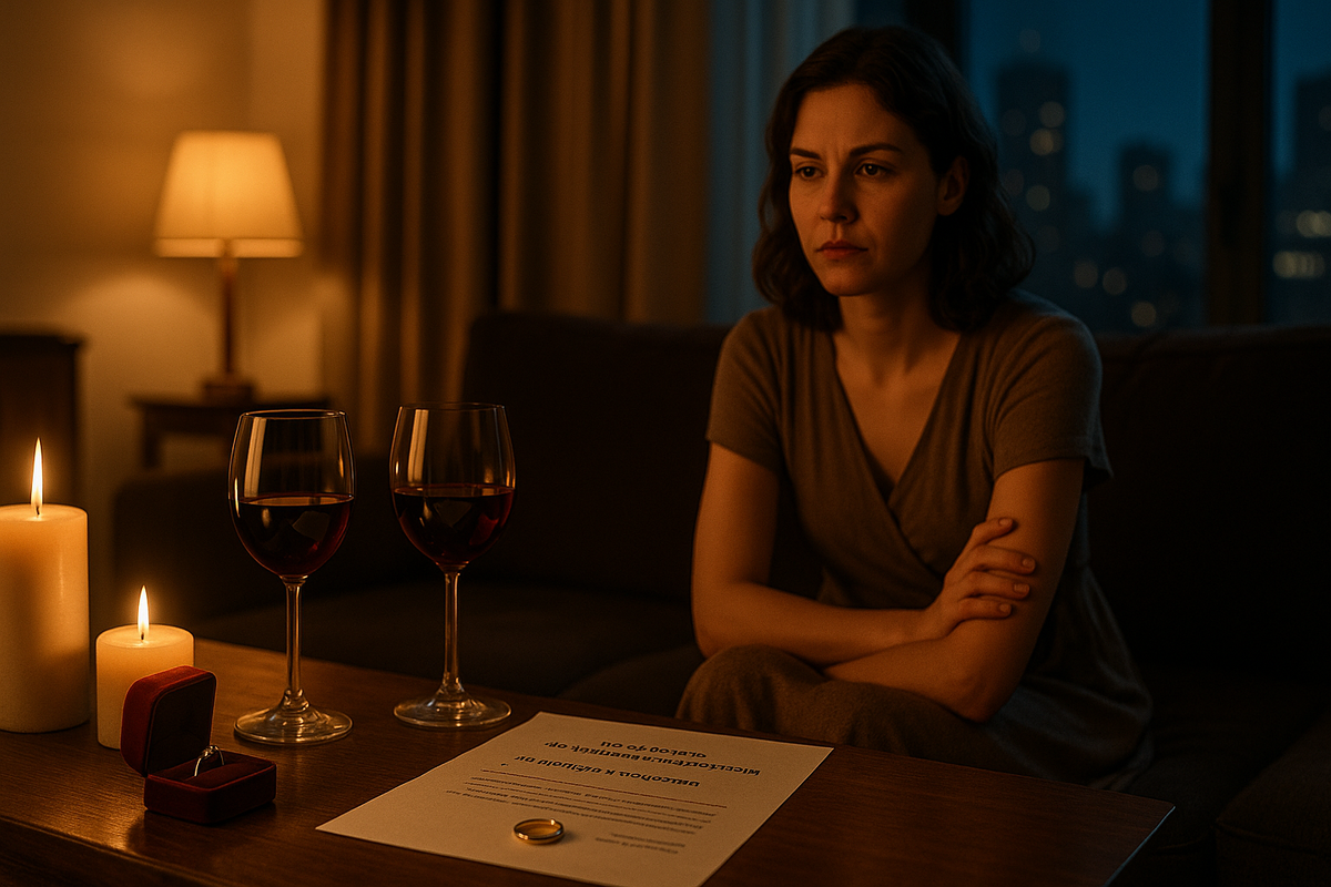 Андрей встал на одно колено в гостиной, между диваном и журнальным столиком. Свечи горели, вино в бокалах, всё как в кино.