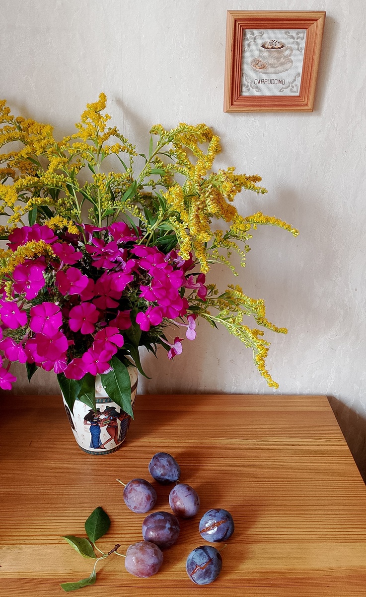 А вы замечали, что каждый месяц пахнет по-своему? Декабрь мандаринами, ноябрь глинтвейном, июнь клубникой, октябрь прелой листвой. Чем пахнет август? Август сегодня пахнет флоксами, золотарником и медовой сливой. Флоксы любимы с детства. Пытаюсь развести на новом месте. Пока прижился один, тот что привезла с собой из Нижегородской губернии. Весной купила ещё корешок в гипермаркете, высадила в клумбу, ни живой, ни мертвый, и не растет, и не дохнет. Думаю выкопать его на зиму в горшок. Есть еще мысль натырить по веточке разных сортов из палисадников у домов, не варварским методом, разумеется, и начеренковать, читала, что флоксы хорошо укореняются. Пы.сы. стырила у соседнего подъезда отцветающую веточку (осуждаете, да?)) белого флокса, начеренковала и поставила на укоренитель. Буду наблюдать) Удивилась, что золотарник предлагают к продаже на садоводческих сайтах. Я думала, он из разряда сорняков, нещадно выдираю где смогу. Но в букете смотрится хорошо. Слива, на которую Любимыч покуша