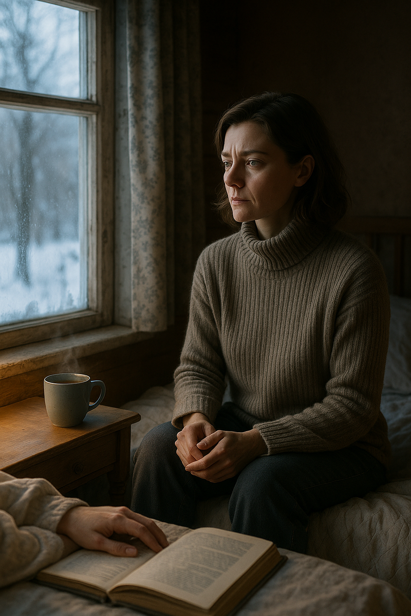 Вечер был тихим, даже слишком. Снег за окном падал медленно и вязко, приглушая звуки деревни. В кухне пахло свежим хлебом и мятным чаем — Валя, как всегда, встретила её уютом, который в городе казался чем-то забытым и редким. Марина сидела у стола, держа ладони вокруг тёплой кружки. С её пальцев уже ушёл холод, но сердце всё ещё сжималось после новостей. — Ну что, как он, твой следователь? — Валя вдруг подняла взгляд от стопки семян и хитро прищурилась. — Алексей? — Марина сделала вид, что ищет ответ в чае. — Да обычный. Вежливый, внимательный… — Внимательный, ага, — усмехнулась Валя. — Я видела, как он на тебя смотрит. Мужчины так не смотрят просто по долгу службы. Марина хмыкнула, но на душе стало теплее. Эти слова застряли где-то глубоко, как едва заметная искра, которую страшно и приятно держать. За окнами темнело. В доме было тихо, только потрескивали дрова в печке. Марина смотрела, как огонь бросает блики на стены, и ловила себя на том, что впервые за долгое время ей не хочется н