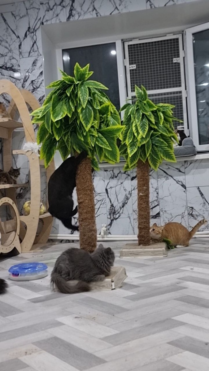 Я Малинку мало вижу, ну как мало, она обычно не играет при мне. Сегодня пришла на вечернюю уборку, а начинаю я у них с лотков. А они тут как распрыгались все, словно обезьяны, по этим пальмам, и Малинка тоже. И вот, бросив лотки, я стала наблюдать, посмеиваясь, за их трюками. Кстати, деревья я приклеила на двустороннюю ленту, пока не снесли, но то, что листьев не будет в скором времени, очевидно. Естественно, кошки не при чём, они у нас не вандалы какие-нибудь, просто скоро осень и оттого листопад.😂 Интересно, кто-то заметит что-то необычное у Малинки?