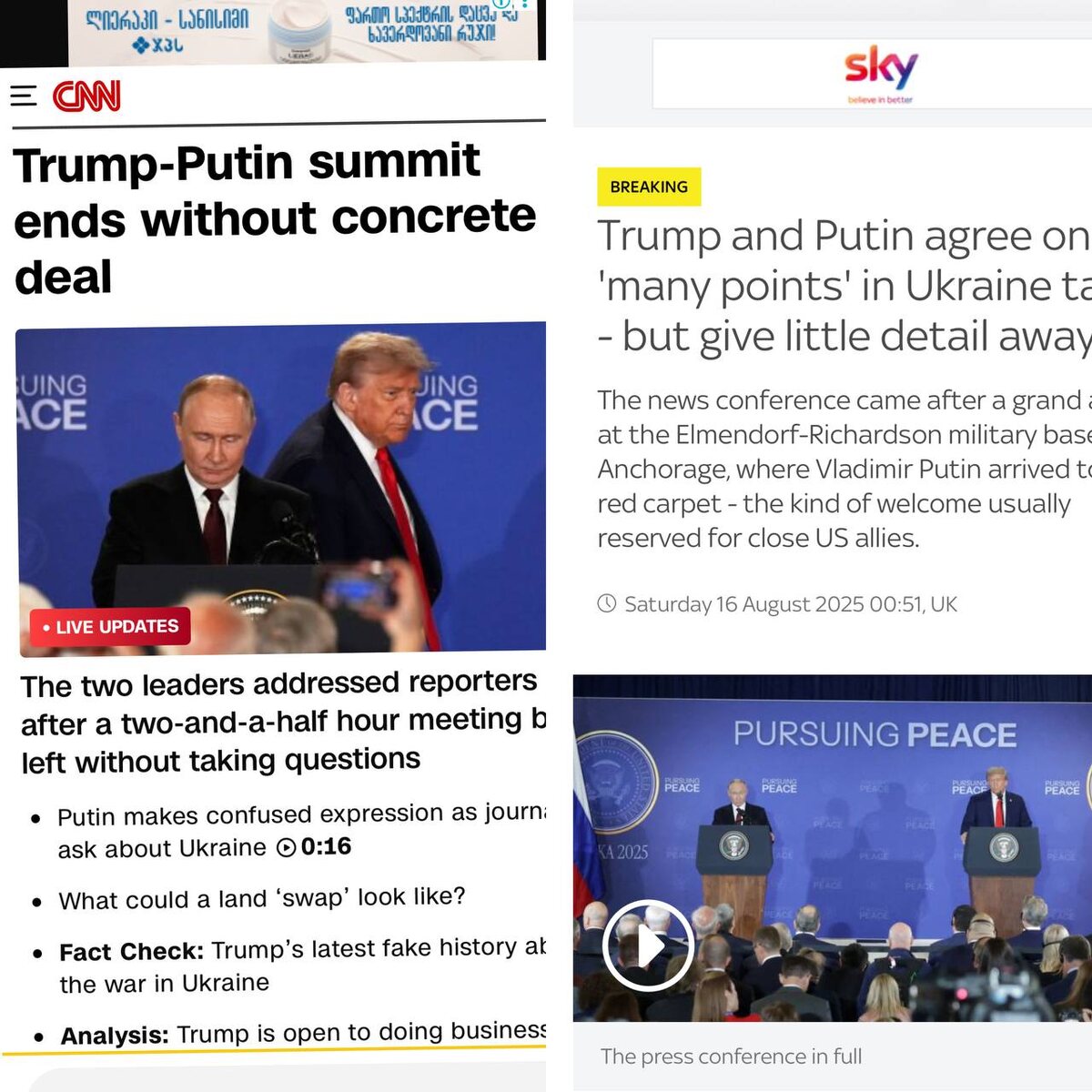 «Отход от типичного протокола» — западные СМИ отмечают, что переговоры прошли не по привычному сценарию CNN пишет, что переговоры прошли не по американской традиции — обычно, когда американский президент принимает у себя иностранного коллегу, пресс-конференция начинается с выступления лидера США, за которым следует его гость. Однако в этот раз речь Путина была первой. Bloomberg отмечает, что главу России пригласили в США впервые за 10 лет, издание также пересказывает слова Трампа о конструктивной встрече. Sky News публикует слова благодарности Трампа к президенту России за его «глубокое» заявление. The Times отмечает, что выступление вызвало больше вопросов, чем дало ответов — якобы «в чем они преуспели — это в восхвалении друг друга». Западные СМИ в целом сходятся во мнении, что встреча прошла необычно и достаточно тепло, но пока не стремятся дать однозначной оценки происходящего. В то же время Bloomberg подмечает, что лидеры РФ и США нашли точки соприкосновения, которые Трамп тепер