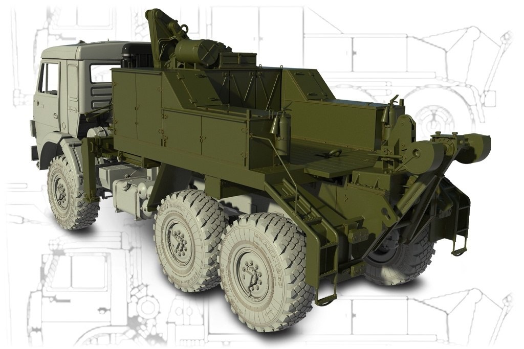 Санкт-петербургская Miniarm выпустила смоляной конверсионный набор, позволяющий построить модель РЭМ МТП-А2 на базе КамАЗ-5350 в масштабе