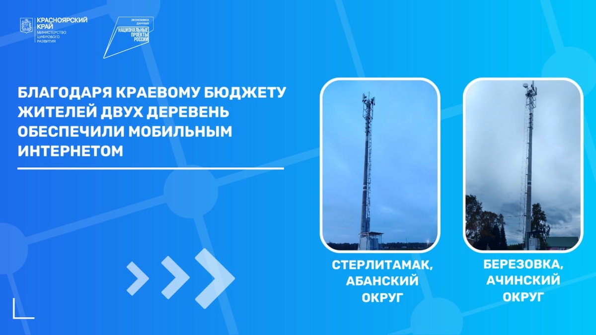 Почти 500 человек в двух деревнях Красноярского края получили доступ к мобильному интернету, сообщило Минцифры. В том же Минцифры жителям краевого центра, где мобильный интернет перестал работать ещё 26 июля, не сообщают, когда в городе-миллионнике восстановят нормальную работу мобильного интернета. А вот жителям деревни Стерлитамак (менее 100 человек) Абанского округа и села Берёзовка (более 360 человек) Ачинского округа повезло. Благодаря краевой госпрограмме «Развитие информационного общества» в деревне Стерлитамак появился мобильный интернет 4G, а в селе Берёзовка местным жителям стали впервые доступны и сотовая связь, и мобильный интернет.