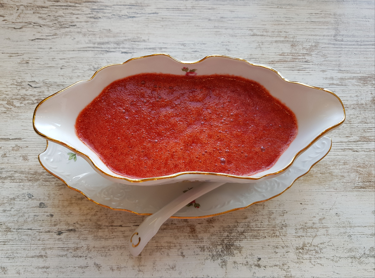 Добрый день, дорогие друзья! На дворе разгар августа и сборы летнего урожая, по утрам всё отчетливее чувствуется приближение осени, и, продолжая традицию прошлого лета, я предлагаю вашему вниманию приготовить насыщенный летними ароматами ягодный соус для новогоднего стола. Для приготовления соуса в готовом виде объемом 0,76 литра нам понадобятся: 900 грамм клубники, 80 грамм сахара, 40 грамм имбиря, 1/2 чайной ложки соли, 1/4 чайной ложки молотого перца чили, 1 столовая ложка бальзамического уксуса. Приготовление: имбирь натереть на мелкой терке. Клубнику промыть, удалить чашелистики, положить в кастрюлю. Добавить соль, сахар, острый перец, тертый имбирь. Нагреть ягоду и проварить на средней температуре 10 минут. Переложить ягоду в чашу измельчителя. Измельчить до однородности. Вернуть соус в кастрюлю, довести до кипения, добавить уксус, перемешать, попробовать, при необходимости скорректировать вкус солью, сахаром, уксусом и перцем. Соус готов! Переложить готовый соус в соусник и