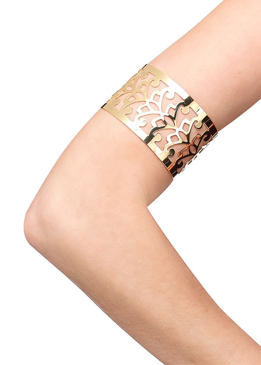 Самый быстрый способ превратить скучный образ в запоминающийся — использовать контраст размеров. В 2025 году этот приём стал особенно актуальным: массивные браслеты носят не только на запястьях, но и поднимают выше — на предплечья. Такой необычный способ ношения мгновенно привлекает внимание и делает даже простую футболку центром притяжения взглядов.