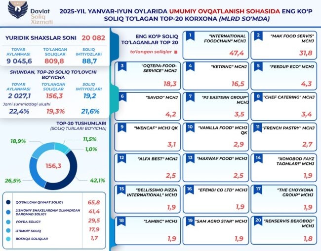 За первое полугоде 2025 года, 20 082 хозяйствующих субъекта, которые осуществляют свою деятельность в сфере общественного питания, уплатили в бюджет нашей страны 809,8 миллиардов сумов. Из них 156,3 миллиардов сумов или 19,3% приходится на 20 организацией. Их общий товарооборот достиг 2 триллионов сумов.