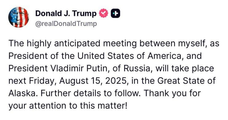 Tramp Putin bilan uchrashuv sanasi va joyini e’lon qildi "Rossiya prezidenti Vladimir Putin bilan uzoq kutilgan uchrashuvim kelasi juma, 15-avgust kuni ulug‘ Alyaska shtatida bo‘lib o‘tadi. Batafsil ma’lumotlar keyinroq beriladi. Masalaga e’tibor qaratganingiz uchun tashakkur!", - deya Amerika yetakchisi o‘zining Truth Social ijtimoiy tarmog‘idagi sahifasida yozdi. @daryolive
