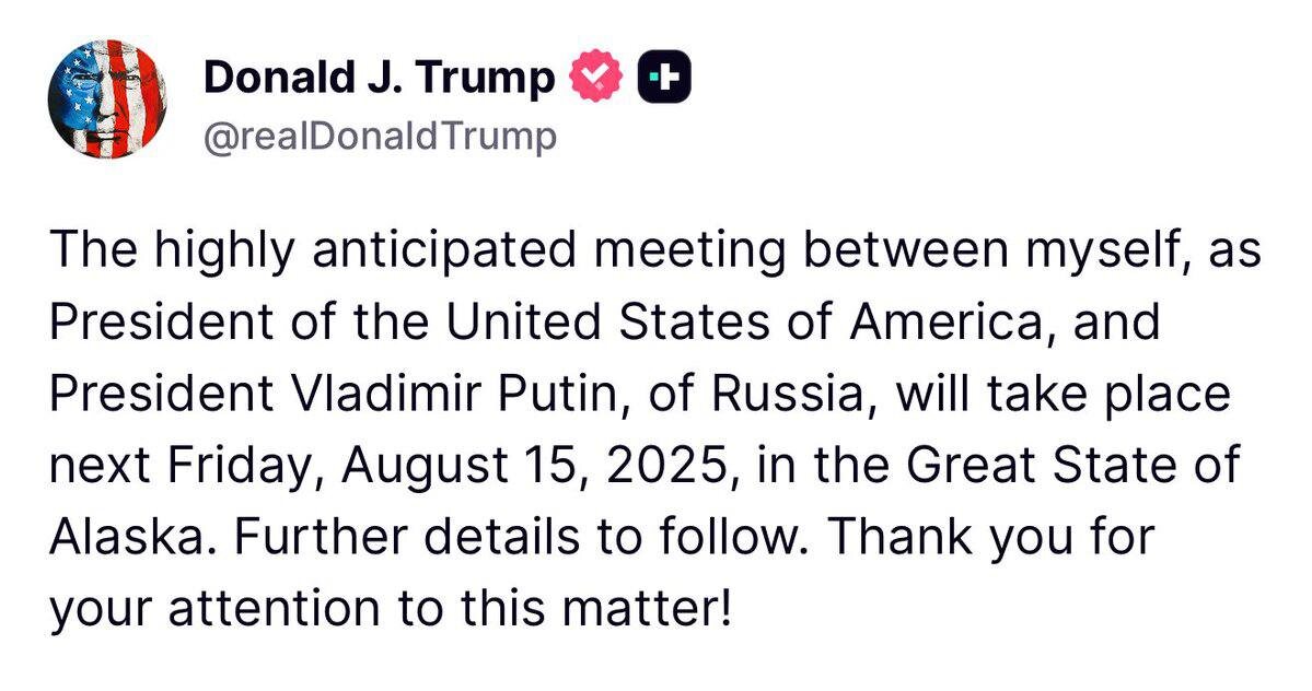 Встреча Путина и Трампа пройдет 15 августа на Аляске, заявил президент США. «UPD. Помощник президента РФ Юрий Ушаков подтвердил, что встреча президентов России и США состоится 15 августа на Аляске. Он отметил, что это логичное место, так как страны — соседи, а в регионе и Арктике у них пересекаются экономические интересы и возможны совместные проекты» Надеюсь всё обойдется без катастрофических сценариев (покушение, взятие в плен, итп).