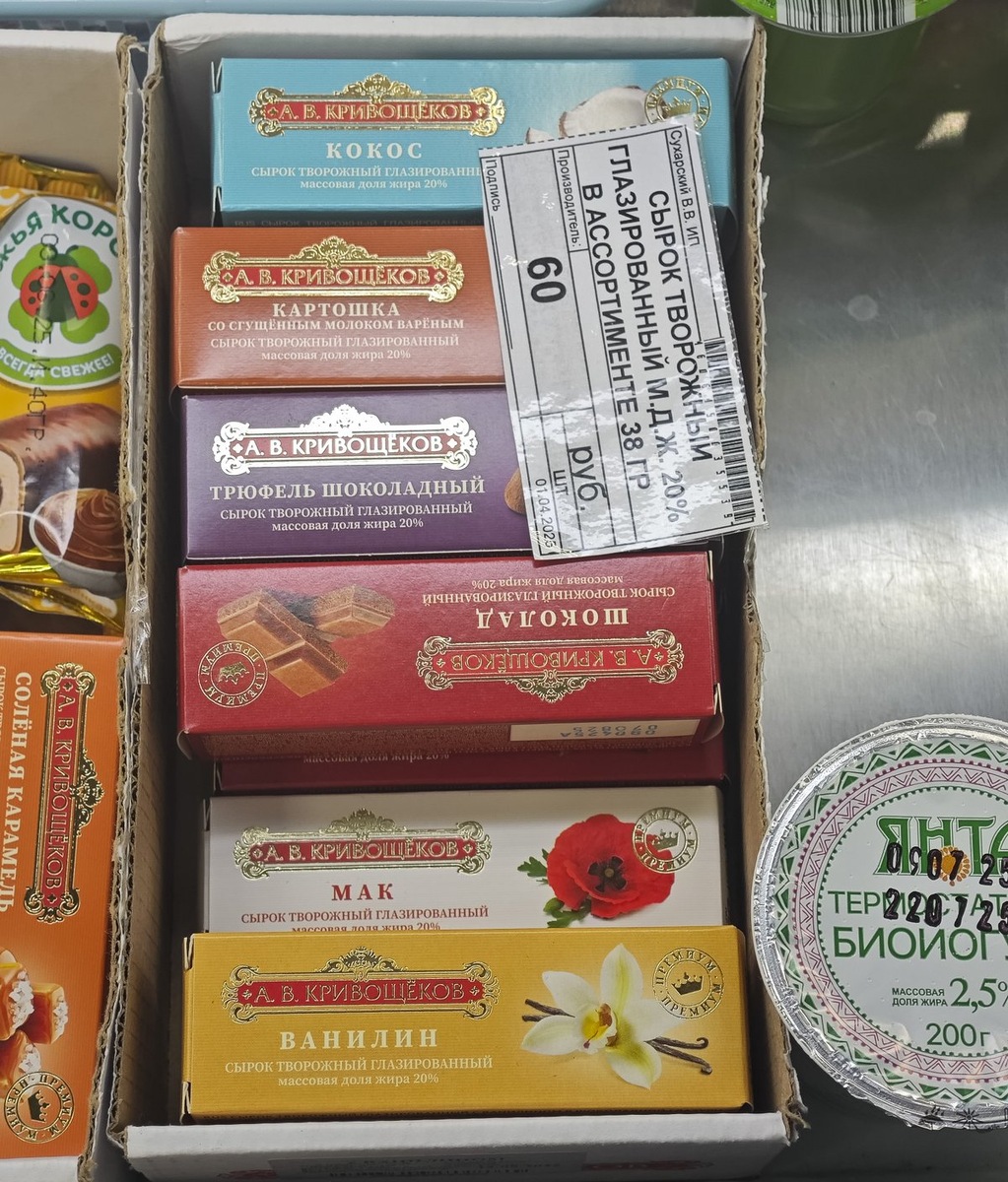 Дополняя рассказ об иркутских продуктовых магазинах, я расскажу об одном из продуктов. В одном из рынков Иркутска я купил творожные сырки «А.В. Кривощёков». Которые по дизайну как две капли похожи на «Б.Ю. Александров». По этому поводу вроде даже суды были. Производит их Сибирский завод молочных продуктов. Среди множества их торговых марок, эта — премиальная. Купить их можно в основном в Сибири. Сейчас «Б.Ю. Александров» уже «А Ростагрокомплекс», но «Кривощёков» держит тот старый дизайн. Я возьму на пробу вкус, который почему-то никто больше не делает. Я ел такие литовские сырки «Сваля» и белорусские сырки. Но сегодня в РФ сырков с маком практически нет. Состав сразу не впечатляет. Тут шоколадная глазурь с пальмовым и «экзотическими» вместо какао-масла, много стабилизаторов, даже ваниль не натуральная. В картонной упаковке фольгированная упаковка. Победнее оформленная, чем в «А Ростагрокомплекс». Ну и консистенция конечно не та. Похожа больше на «творобушки». Глазурь «плывёт», не шокол
