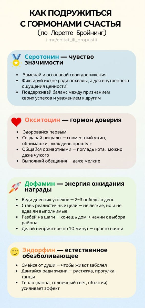 » Не про «стать счастливым», а про то, как перестать воевать с собственным мозгом. Простые действия для серотонина, окситоцина, дофамина и эндорфина — без эзотерики и мотивационных лозунгов. 🎙 Подробно разбирал эту книгу в выпуске подкаста: ссылка на пост #инфографика #счастье #привычки #психология