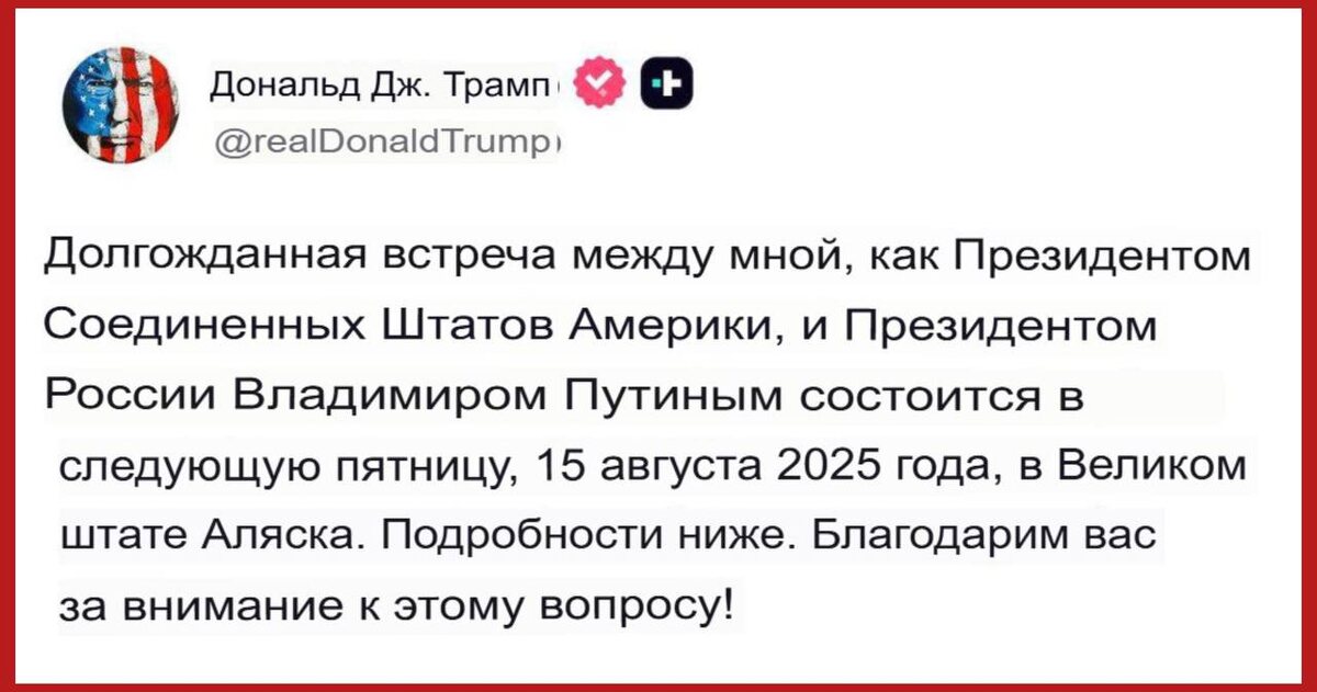 ‼️Трамп заявил, что его встреча с Путиным состоится 15 августа на Аляске, детали он огласит позднее