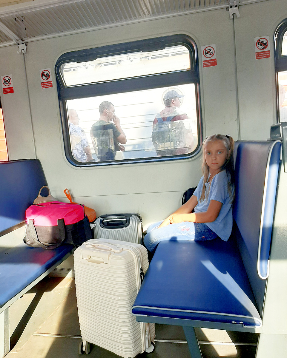 Началось наше путешествие Сергиев Посад – Казань. Добирались до Москвы общественным транспортом. Сначала на газели до вокзала Сергиева Посада, далее доползли на электричку, которая идёт до Москвы. Мне казалось, что мои два чемодана, сумка, рюкзак и дочка мешали всем вокруг. В газели, когда водитель резко остановился, наши чемоданы покатились по салону. Водитель стал извиняться, что так вышло и интересовался нет ли у кого травмы. Видимо чемоданы создали такой шум, что он подумал, что это народ попадал с мест. Люди сообщили, что все целы и это чемоданы катаются по салону. Почему чемоданам не придумали тормозную систему? На вокзале положили наш багаж на ленту и после успешно сели в электричку. Дело было вечером и желающих поехать в Москву было мало. Мы заняли отдельные два диванчике. В пути дочка Лёля познакомилась с девочкой, так как мой ребёнок очень общительный, знакомство у неё завязывается легко. Девочка тоже оказалась общительной. Два раговорчивых ребёнка – это катастрофа. Прибыли