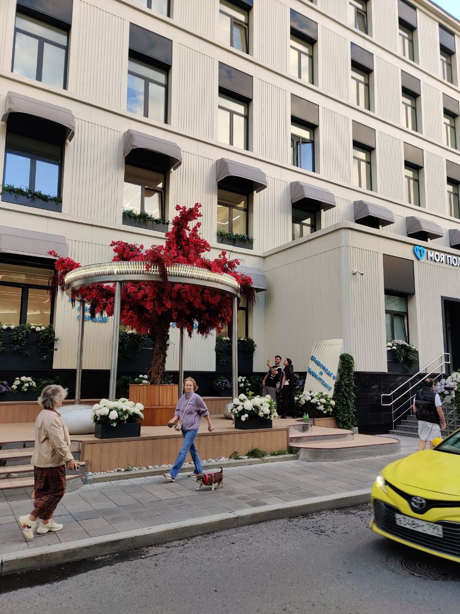 Пожалуй, самая неожиданная веранда на Патриках находится прямо напротив синагоги и принадлежит районной поликлинике. В меню кофе и выпечка по совсем непатриканским ценам. То ли они, то ли яркое цветочное оформление, то ли похожий на обвесы Louis Vuitton серебристый декор на фасаде, но она явно бьет рекорды по привлекательности. Тут даже миски с водой для животных есть, знает поликлиника свой контингент. @foodisvovery