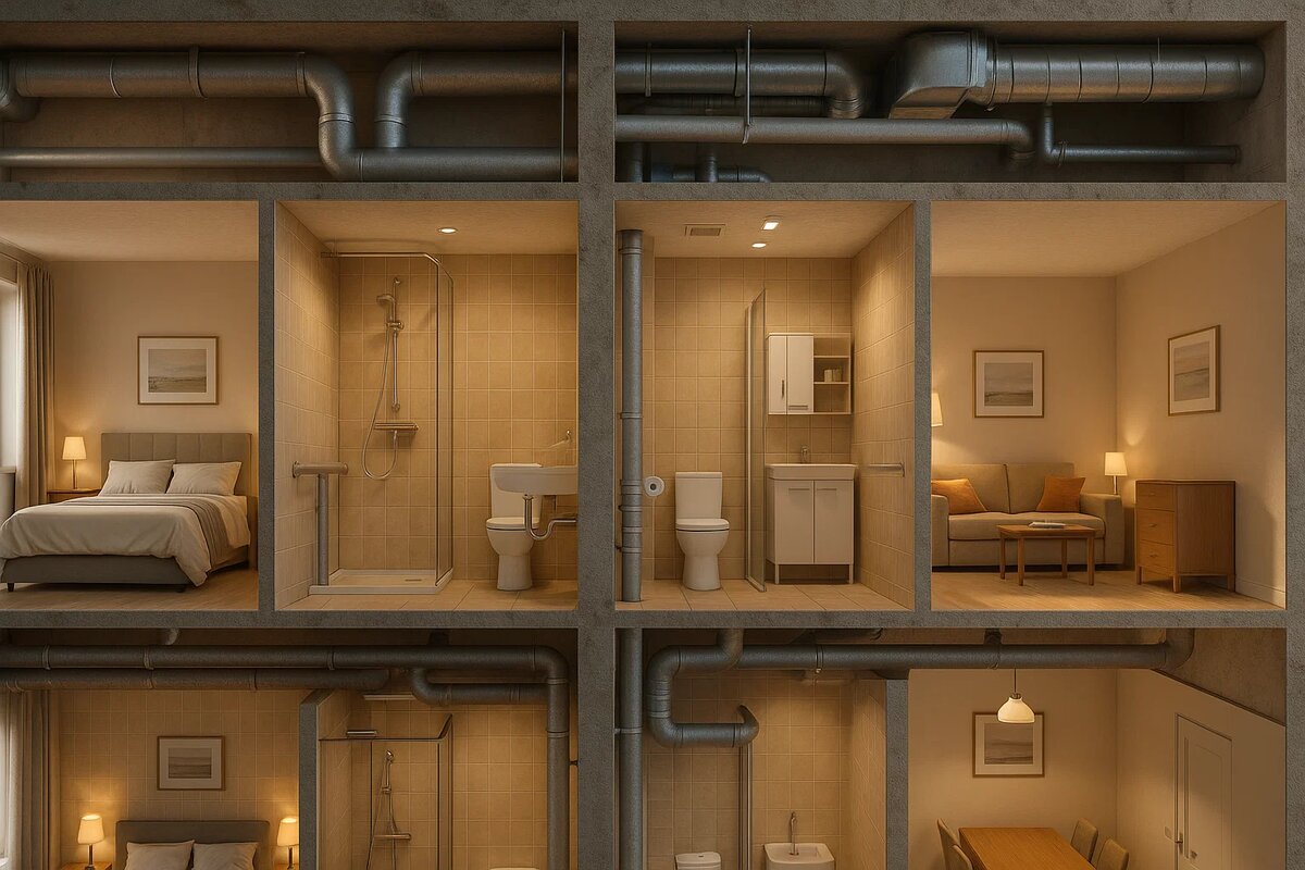 В многоэтажных домах санузлы располагают строго друг над другом — и это не прихоть архитекторов, а железная логика. Один стояк, один узел прохода через перекрытие, минимум проблем с гидроизоляцией.