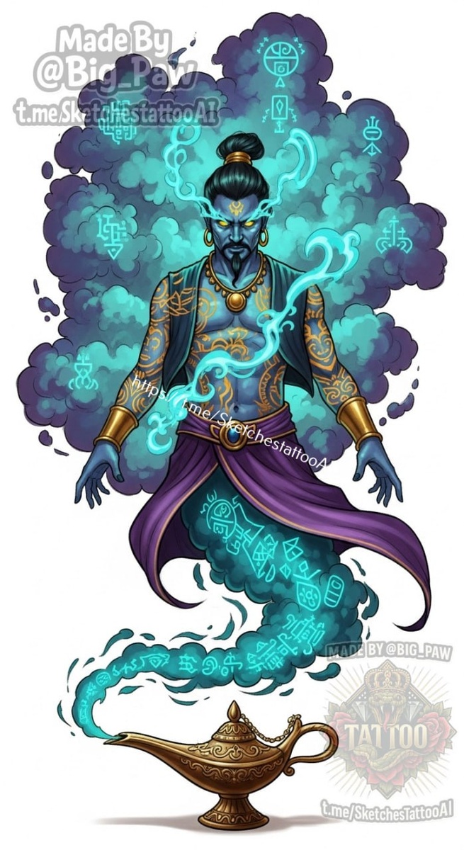 #2660 Подборка по запросу подписчика - Тату эскиз Джина в мистическом стиле, реализм, в цвете, детализация 🧠 SYNTX 💳 Донат 😎 НейроБро 😎 Эскизы без вотера 💀 Эскизы от нейросети #джин #реализм #мистика #эскиз #тату #татуировка