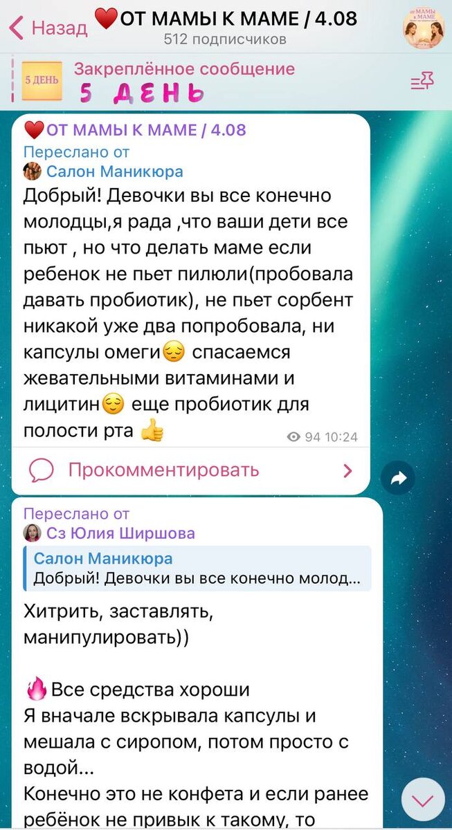 У меня сейчас в команде идет марафон "ОТ МАМЫ К МАМЕ", где девочки делятся наработанными схемами по детскому здоровью, все это при поддержке врачей с консультациями и ответами на вопросы Решила с вами поделиться двумя скринами по поводу капсул - это всегда большой вопрос, как выпоить ребенку витамины, если он отказывается. Вот реальный опыт других мам, берите на вооружение!