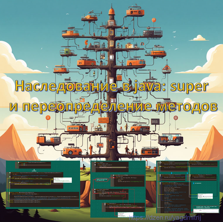 В прошлой статье мы остановились на том, как работают конструкторы без параметров при наследовании классов. В этой статье разберем: 1. Как работают конструкторы с параметрами 2. Ключевое слово super 3. Переопределение методов. Если за вызов конструктора суперкласса без параметров отвечает компилятор и нам не приходится напрягаться, то вызов конструктора с параметрами нам придётся оформить самим... с помощью ключевого слова super. Смотрим как это работает: Оператор super является мощным инструментом, который помогает реализовать принципы полиморфизма и наследования в java, обеспечивая корректную работу иерархии классов. Как мы и говорили ранее, создаем один объект Otez, а вызываются три конструктора: один – из класса Otez, два других из Pol и Semja. Вследствие чего, переменная imja инициализируется в самом конструкторе класса Otez, а переменные pol и familija – в конструкторах классов Pol и Semja через вызов конструкторов суперклассов с помощью ключевого слова super. Важное условие: вы