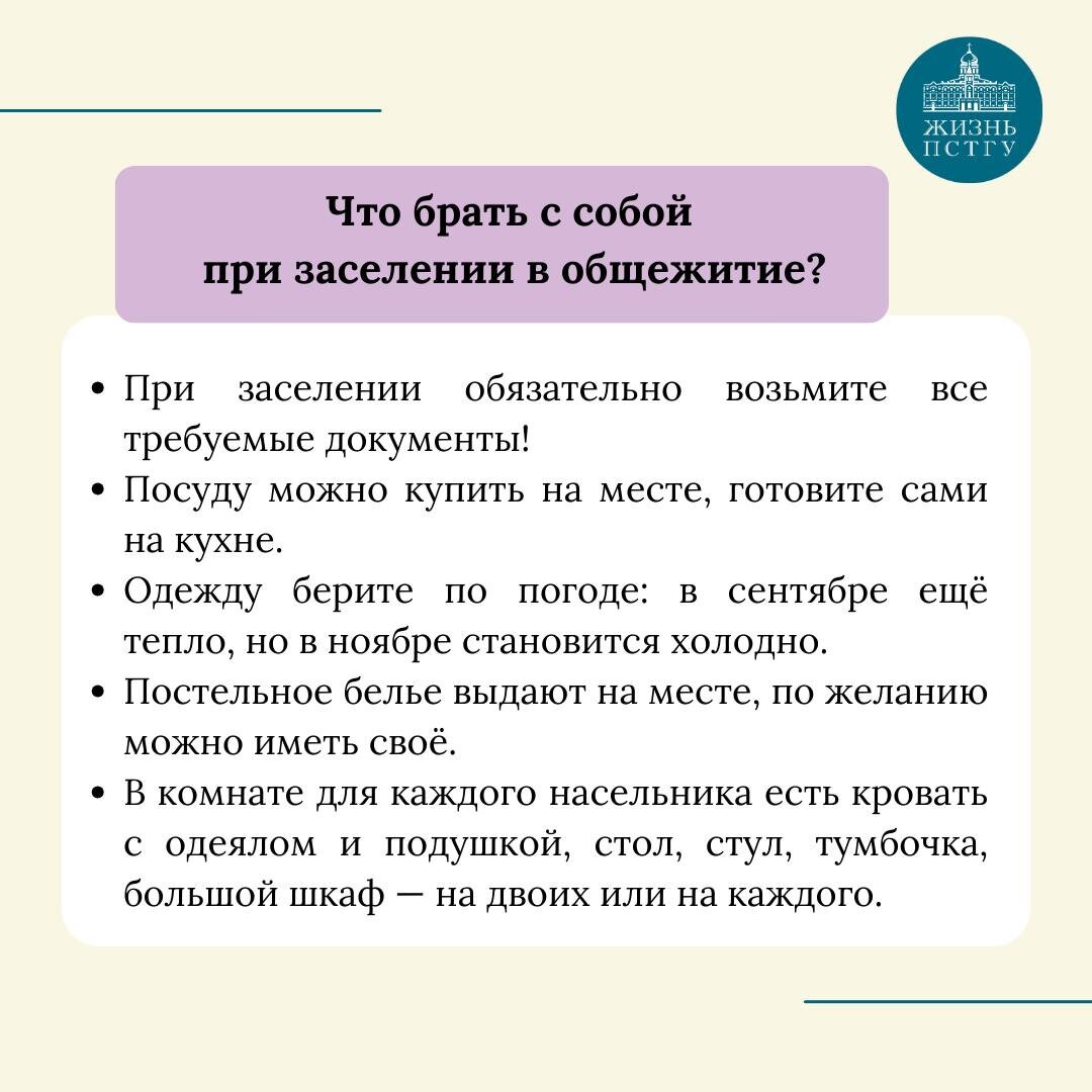 Часто задаваемые вопросы при заселении в общежитие Начинаете собирать чемодан и не знаете, что взять с собой? Предлагаем подборку ответов на часто задаваемые вопросы об общежитии. Если вопросы ещё остались — напишите на эл. почту в отдел по социальной работе со студентами: osr@pstgu.ru #Отдел_по_социальной_работе_ПСТГУ