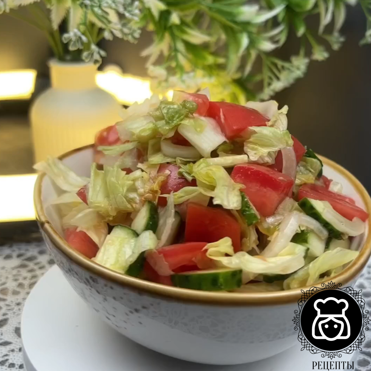 Салат с помидорами, огурцами и салатом Айсберг с вкусной заправкой