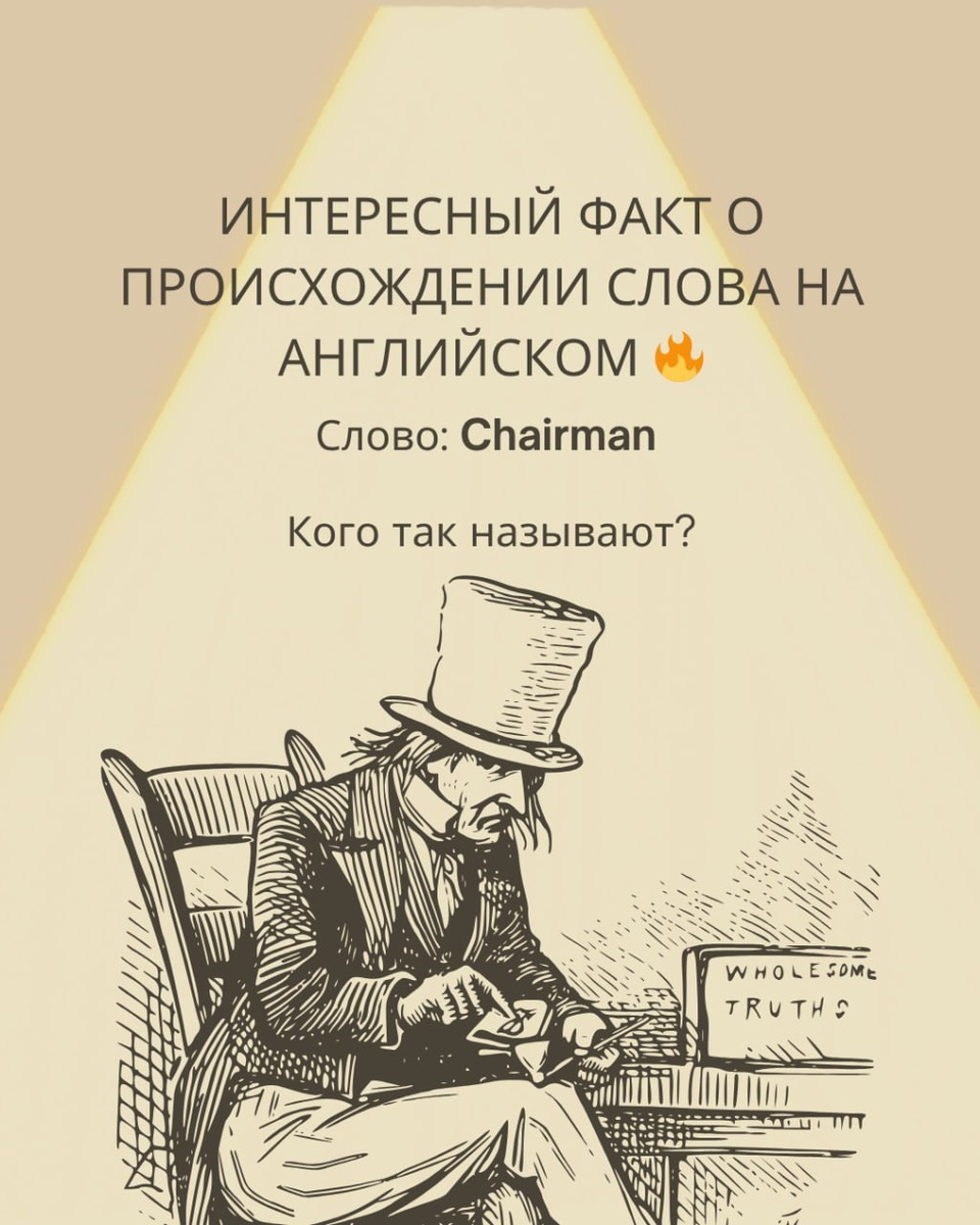 Интересный факт о происхождении слова на английском 🔥 📚 Слово: Chairman 🌍 Происхождение: Слово chairman пришло из староанглийского языка и образовалось путем соединения двух частей: "Chair" (стул, кресло) "Man" (человек, управляющий заседания) 🎯 Изначально обозначало того, кто сидел на специальном стуле (кресле) и руководил собранием или заседанием. Как вы думаете, какой современный смысл этого слова? 📌 Интересно? Ставь ❤️ и подписывайся на наш канал! #английскийонлайн #разговорныйанглийский #английскийнафилиппинах #английскийзарубежом #изучениеанглийского