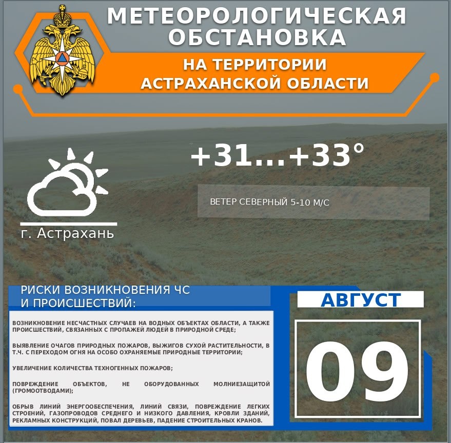 🏖Метеорологическая обстановка на 9 августа 🌿На территории области переменная облачность. Местами кратковременный дождь🌦, гроза. Ветер северный 5-10 м/с, местами порывы 15-17 м/с. Температура воздуха +29...+34°🌡 🌤По г. Астрахань переменная облачность. Без существенных осадков.Ветер северный 5-10 м/с. Температура воздуха +31...+33°🌡