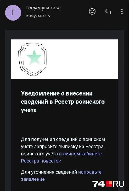 Южноуральцы начали получать на «Госуслугах» уведомления о внесении сведений в реестр воинского учета А в письме ссылка на реестр электронных повесток, точнее — на личный кабинет получателя в этом реестре. «Пришло такое письмо счастья с утра. Понятно, что не повестка, но что это значит вообще?» — задался вопросом читатель @74.ru Алексей. 🟥Мнение юриста. Такие письма просто уведомляют о существовании реестра электронных повесток. Личный кабинет в этом реестре есть у каждого военнообязанного, объяснил Евгений Крылов нашим коллегам из @e1_news. «Госуслуги» не уведомляют конкретного человека о том, что ему нужно прибыть куда-то, подчеркнул юрист. Но если военкомат отправит повестку, она будет считаться врученной незамедлительно, и неважно заходили вы в личный кабинет, чтобы увидеть ее, или нет. Есть аккаунт — повестка вручена. 🟥А если аккаунта нет. Тогда она тоже считается врученной, но через семь дней. Считается, что вы сами должны проверять, пришла ли вам электронная повестка. Сказ