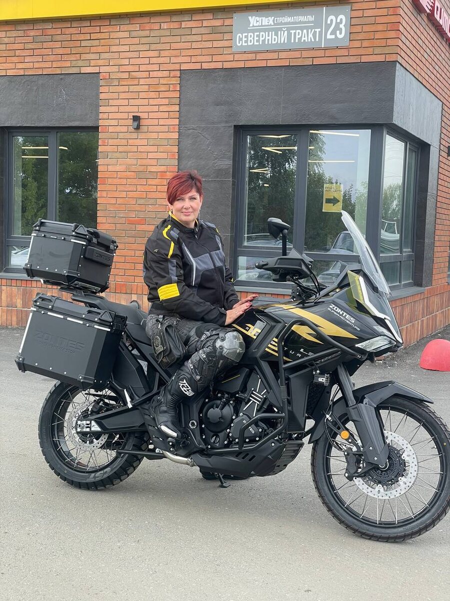 Шикарная женщина на шикарном мотоцикле 🎉Поздравляем Елену с исполнением мечты! ✨ Долгие раздумья позади — и вот он, ZONTES ZT703-F TOUR в стильном черно-золотом облике, готов покорять дороги! 🔥Особый респект супругу за крутой сюрприз — такая поддержка дорогого стоит! 👊 Газ в пол, попутного ветра и только счастливых километров! 🚀