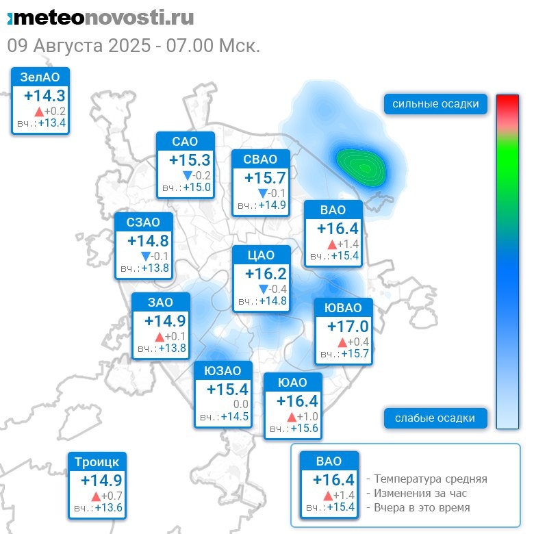 В 7:00 в Москве было от +14°C до +17.4°C, средняя температура +15.7°C #погода #Москва #лето #температура #9августа #суббота Перейти на сайт Прогноз погоды на 14 дней