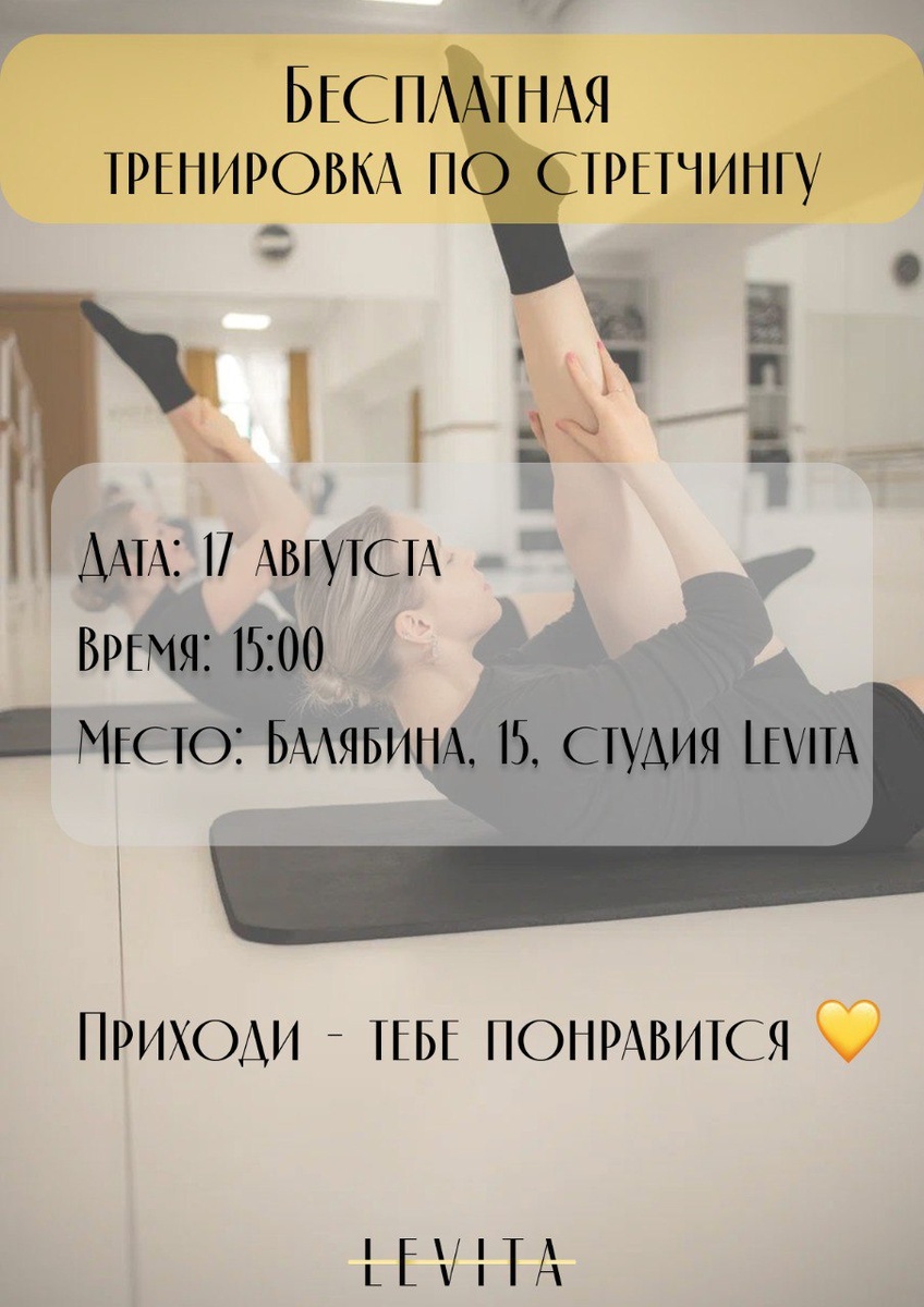 Потянемся? На бесплатной тренировке по стрейчингу 🕐17 августа, 15:00 📍Балябина, 15, студия LEVITA 🔑записаться можно здесь #Новости Предложить публикацию:@zabkulisye_bot
