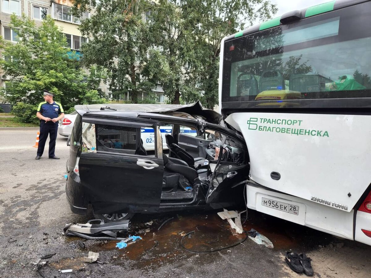 Автобус и легковой автомобиль столкнулись в Благовещенске