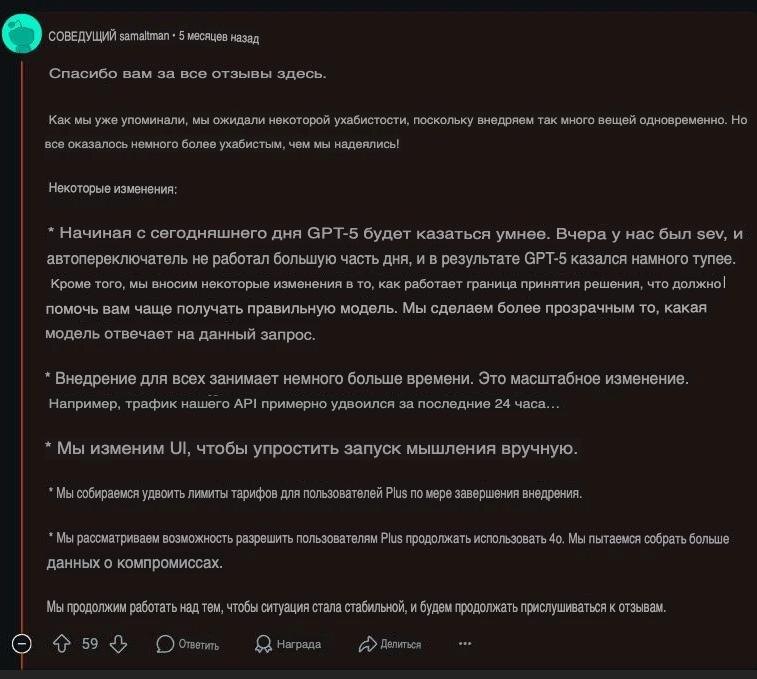 Релиз GPT-5 и первые проблемы Вчера на пресс-конференции Сэм очень подробно объяснил причины низкой производительности модели GPT-5 и проблемы с данными, а также соответствующие исправления и раскрыл дальнейшие планы. Ход развертывания GPT-5 и технические проблемы: 🔴GPT-5 столкнулся со значительными техническими проблемами на раннем этапе, в частности, с отказом автокоммутатора, что привело к значительному снижению производительности модели. 🔴Массовые развертывания привели к удвоению трафика API за 24 часа и колебаниям сервисов для сотен миллионов пользователей. Команда ожидает стабильности через день-два и уже удвоила лимит скорости для пользователей ChatGPT Plus. 🔴Ошибки маршрутизации в задачах, связанных с программированием, приводят к тому, что GPT-5 плохо работает при генерации кода и других аспектах, требуя ручного запуска «режима мышления» или явного требования к модели «тщательно подумать». 🔴Человеческая ошибка в живой презентации привела к искажению гистограмм, но д
