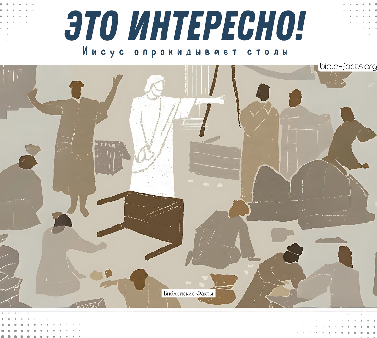 А вы знали, что сцена, где Иисус опрокидывает столы в Храме, является одной из немногих, которая описана во всех четырех Евангелиях? У Матфея, Марка и Луки это событие происходит в последнюю неделю перед распятием, а вот Иоанн помещает эту историю в самое начало служения Христа, сразу после его первого чуда. Матфея 21:12–13