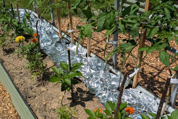 - Откажитесь от светоотражающей мульчи. При нормальной температуре она полезна. В сильную жару это всё равно что положить помидоры в солярий, когда они и так перегрелись. Уберите фольгу и дайте почве подышать.