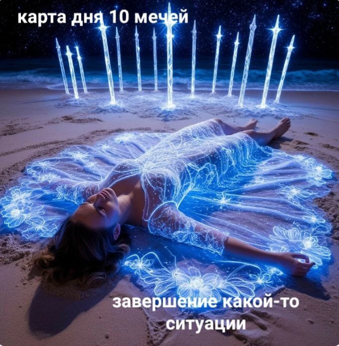 Карта дня 10 мечей Завершение одного жизненного этапа и начала нового. Думаю, что сегодня эта карта в основном связана с астономическим явлением "Врата Льва". Завершается один цикл и открывает дорогу новому. Вместе с расставанием с прошлым придет облегчение и осознание, что все лучшее ждет впереди. Если правильно себя настроить, то Десятка мечей в карте дня станет не угрозой, а открытием себя новому.