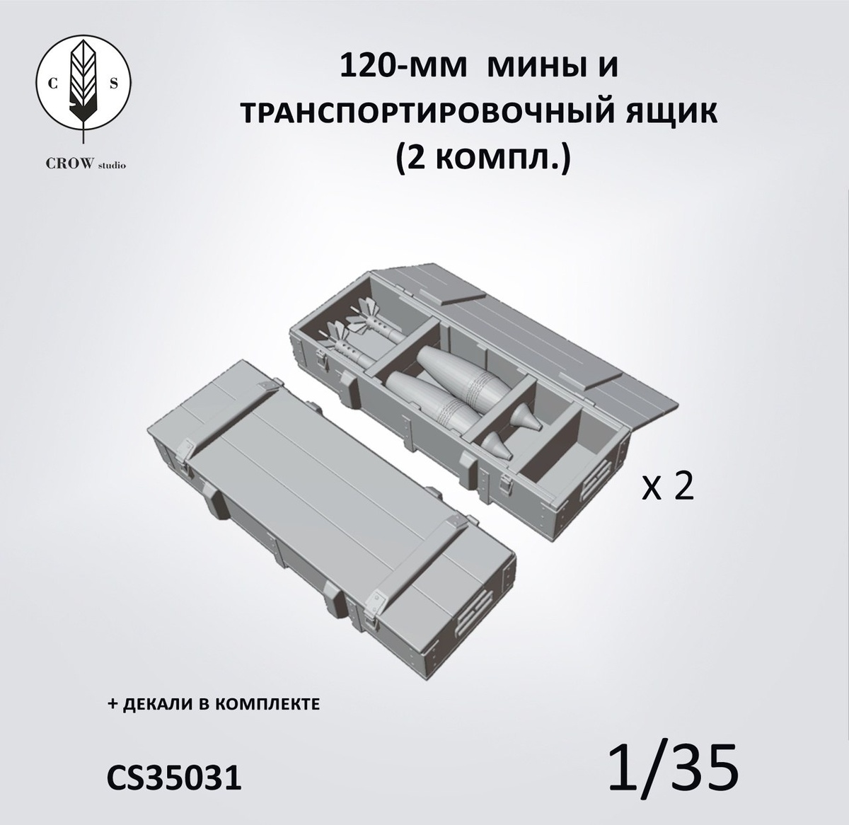 CROW Studio из Санкт-Петербурга на 3D-принтере выпустила модели 120-мм минометных мин и транспортировочных ящиков для них с декалями в масштабе 1/35: 35031 Ящик и 120-мм мины (2 компл.) 35032 Закрытые ящики для 120-мм мин (3 шт.)