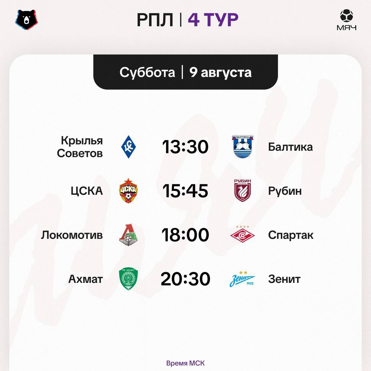 Большой игровой день в 4-м туре РПЛ сегодня: «Крылья» против «Балтики», ЦСКА примет «Рубин», а «Зенит» едет в Грозный. Сегодня состоится возвращение Станислава Черчесова. Матч тура — лидирующий «Локомотив» против «Спартака». Важнейшая игра для Станковича🔥