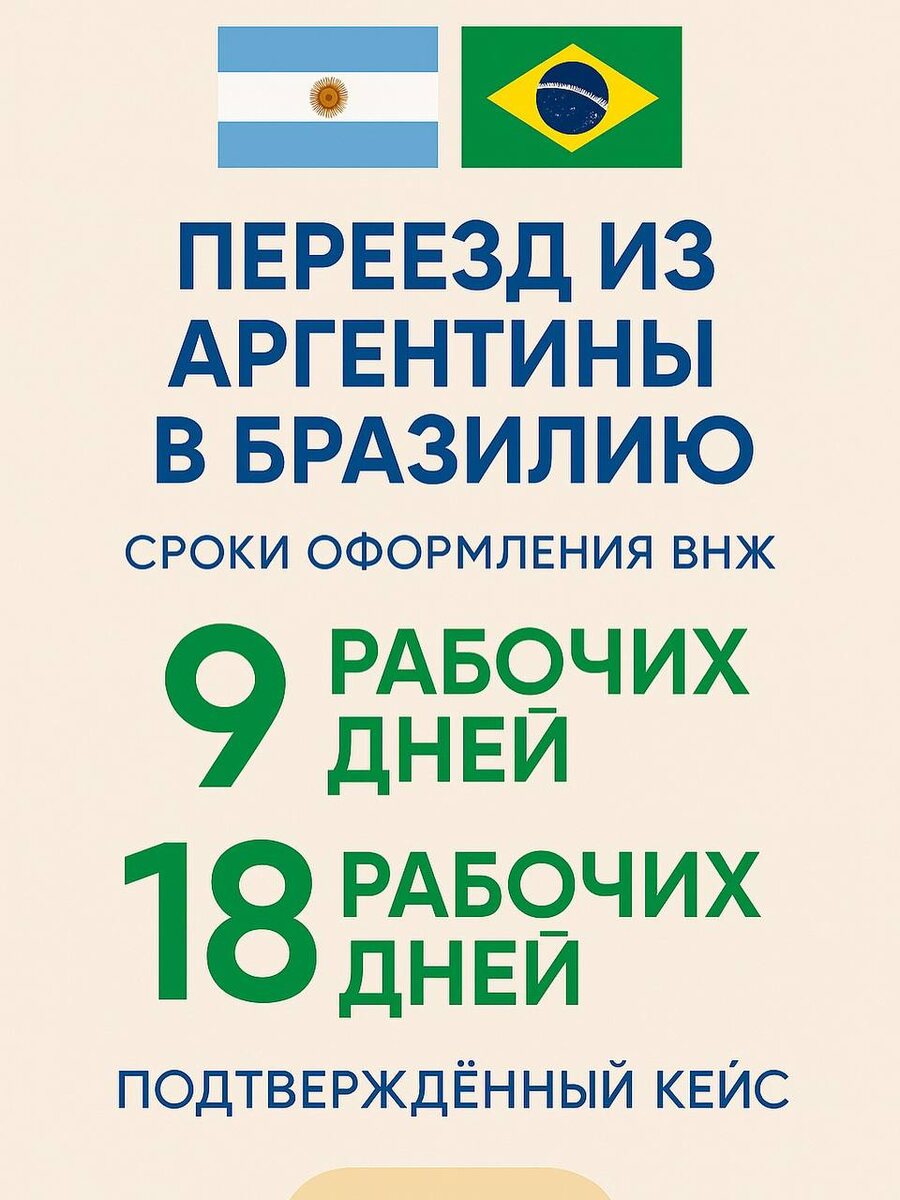 🇦🇷✨ История семьи из Аргентины, переехавшей в Бразилию К нам обратилась семья, которая хотела переехать в Бразилию на длительное проживание. Роды не планировались — цель была оформить ВНЖ для всей семьи. 📄 По договору мы гарантируем оформление за 40 рабочих дней — будь то роды, студенческий ВНЖ, брак или иная легализация. 🔹 Ход процесса: • 9 июля 2025 — получен полный пакет документов. • 10 июля — старт отсчёта. • 22 июля — мама и ребёнок получили ВНЖ по учёбе (9 рабочих дней). • 4 августа — ВНЖ получили муж и бабушка (18 рабочих дней). • Между этапами — 9 рабочих дней. 📌 Вся семья из четырёх человек получила ВНЖ вдвое быстрее заявленного срока. ✅ Мы не только сопровождаем роды — мы организуем легальный переезд в Бразилию под ключ. От сбора документов до последней подписи в миграционной службе — всегда с гарантированным результатом.