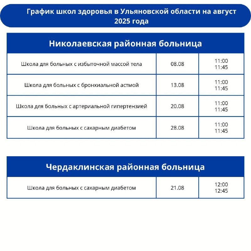 Минздрав напоминает о Школах здоровья, действующих при больницах и поликлиниках региона Занятия проводят по таким актуальным темам, как: ❤️ Артериальная гипертензия (гипертония) 🫀 Сердечная недостаточность 🩸 Сахарный диабет 🫁 Бронхиальная астма 🦴 Заболевания суставов и позвоночника 🏋️♀️ Избыточный вес и ожирение Повышение уровня здоровья населения и профилактика заболеваний - одна из главных задач нацпроекта «Продолжительная и активная жизнь». ➡️Расписание занятий - в карточках