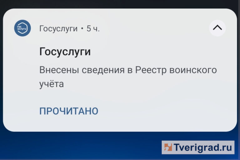 Идёт массовая рассылка. Жителям Тверской области, которые зарегистрированы на портале «Госуслуги», начали приходить уведомления от сервиса о включении в Реестр воинского учёта. Эта система перешла из тестового в штатный режим работы в мае этого года. Реестр позволит собирать данные о военнообязанных гражданах, вносить в базу сведения о них, а также отправлять повестки. На этой платформе будет содержаться информация – стоит человек на воинском учёте или уже снят, получает он отсрочку от призыва или должен явиться на сборный пункт и т.д. Напомним, в этом году весенний призыв впервые прошёл с использованием единого реестра повесток. В апреле 2024 года Президент РФ Владимир Путин подписал закон об электронных повестках. Они могут дублировать ту информацию, что послали заказным почтовым отправлением. Ранее в Госдуме одобрили новые правила призыва на срочную службу в армию.