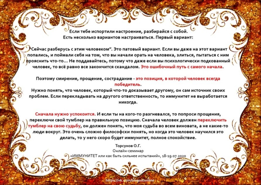 ЕСЛИ ТЕБЕ ИСПОРТИЛИ НАСТРОЕНИЕ, разбирайся с собой. Есть несколько вариантов настраиваться. Первый вариант: “Сейчас разберусь с этим человеком”. Это патовый вариант. Если вы даже на этот вариант попались, и поймали себя на том, что вы начали орать на человека, злиться, пытаться с ним прояснить что-то… Не поддавайтесь, потому что даже если вы психологически подкованный человек, то всё равно все закончится скандалом. Это ошибочный путь с самого начала. Поэтому смирение, прощение, сострадание - это позиция, в которой человек всегда победитель. Нужно понять, что человек, который что-то доказывает другому, он сам источник своих проблем. Если перекладывать на другого ответственность, то иммунитет не выработается никогда. Сначала нужно успокоится. И если ты на кого-то разгневался, то попроси прощения, переключи свой тумблер на правильную позицию. Сначала человек должен переключить тумблер на свою судьбу, он должен понять, что моя судьба во всем виновата, а не какие-то люди вокруг.
