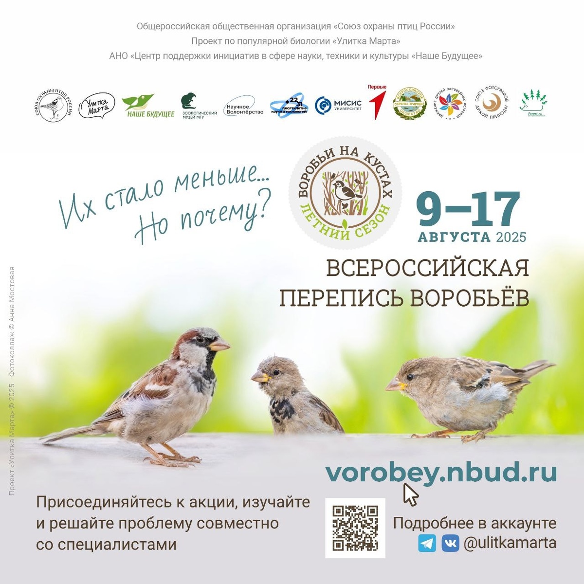 Ну что, друзья, как насчёт посчитать воробушков вместе? 😌 👉🏻 С 9 по 17 августа 2025 года приглашаем к участию в летнем сезоне ВСЕРОССИЙСКОЙ ПЕРЕПИСИ ВОРОБЬЁВ «Воробьи на кустах». Всю информацию о ходе проведения акции и подробные инструкции смотрите в группе Улитка МАРТА - популярная биология. ✍🏻❓ ЗАЧЕМ УЧАСТВОВАТЬ В последнее время отмечается снижение численности воробьёв. Реальная причина до сих пор не ясна. В нашей стране необходимо проводить масштабные и системные отслеживания численности воробьёв для понимания ситуации и анализа изменений. Давайте поможем специалистам собрать конкретные сведения о численности воробьёв во всех регионах России! ✅ КАК УЧАСТВОВАТЬ С 9 по 17 августа 2025 найти воробьиный куст и/или посчитать количество встреченных во время прогулки воробьёв, сфотографировать наблюдение на каждой точке встречи, определить и запомнить координаты места встречи и ответственно внести ВСЕ эти данные на сайт мероприятия ☀ vorobey.nbud.ru ☀ . Если хотя бы одно наблюдени