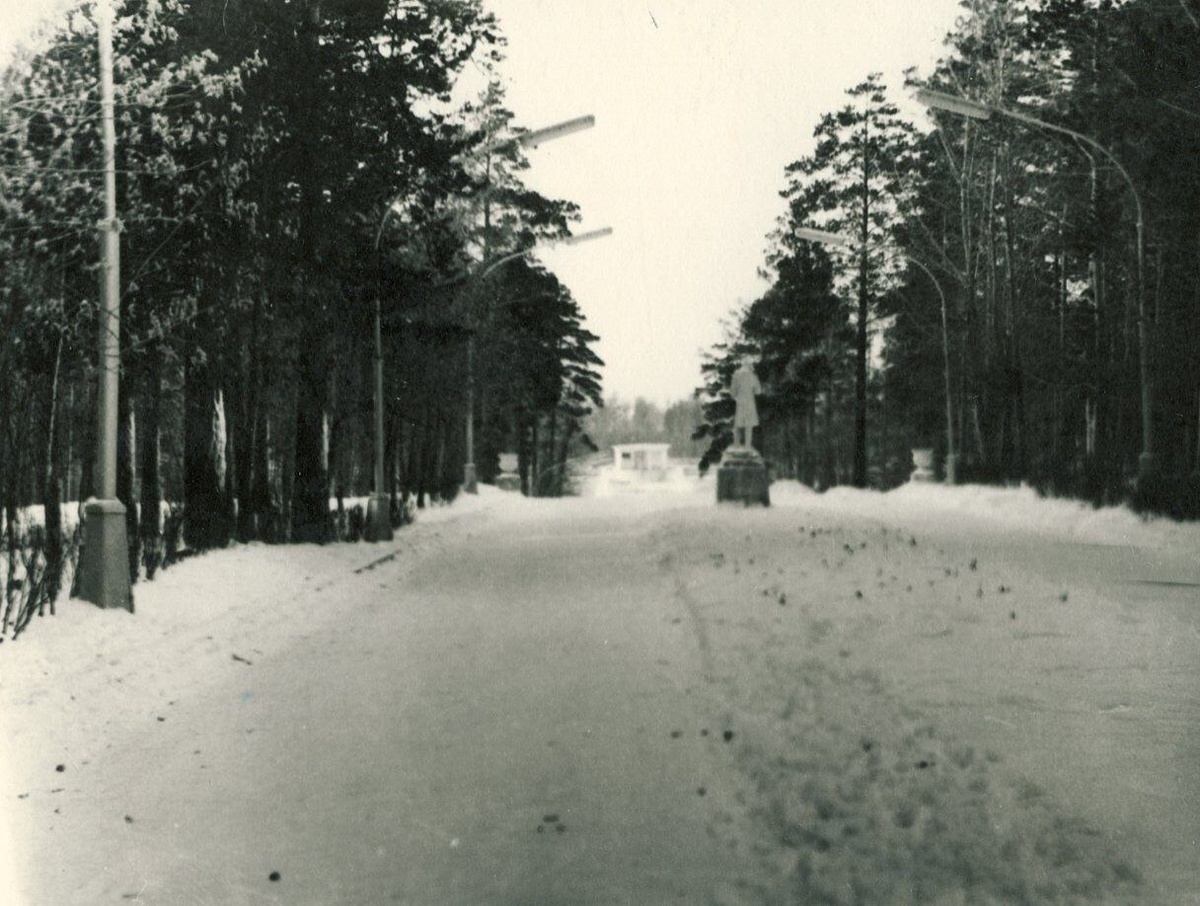 #РетроСеверск 60/70-е. Зимние аллеи нашего парка. Гимназист Ульянов (памятник) устремил свой взор на стадион "Труд". И "комментаторская будка" стадиона хорошо видна. На втором фото это место в наши дни. Фото из архива Сергея Тарасуна Автор Михаил Васендин