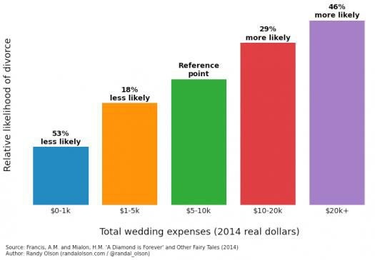 Дорогие свадьбы УНИЧТОЖАЮТ браки — исследование. Если на праздник молодожены потратили больше $20 тысяч (около 1,5 млн рублей), то вероятность расставания повышается на 46%. При этом если на свадьбу было потрачено меньше $1 тысячи (около 80 тысяч рублей), то риск разойтись уменьшается на 53%. Секрет прост: часто дорогие свадьбы организуют в кредит, что приводит к стрессу из-за долга. Кроме того, много денег на торжество часто тратят более импульсивные люди, которые не умеют находиться в долгосрочных отношениях. Научное доказательство фразы «счастье любит тишину»