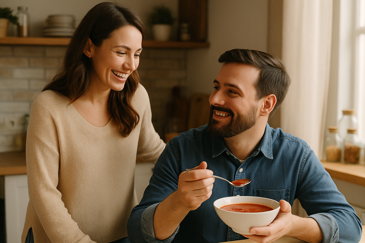 Или просто заказывали доставку. Но спустя два года брака меня вдруг осенило: пора! Решила сварить борщ. По рецепту из интернета, сразу по взрослому. Мужу не сказала, что сама готовлю — если не получится, скажу, что это доставка. Варила весь день. Пот лил градом, кухня в красных каплях свёклы, я с телефоном в руках — сверяю каждый шаг: «пассировать», «бланшировать»… Слов-то не знаю, а уже повар! Вечером приходит муж. Садится. Пробует. И вдруг: