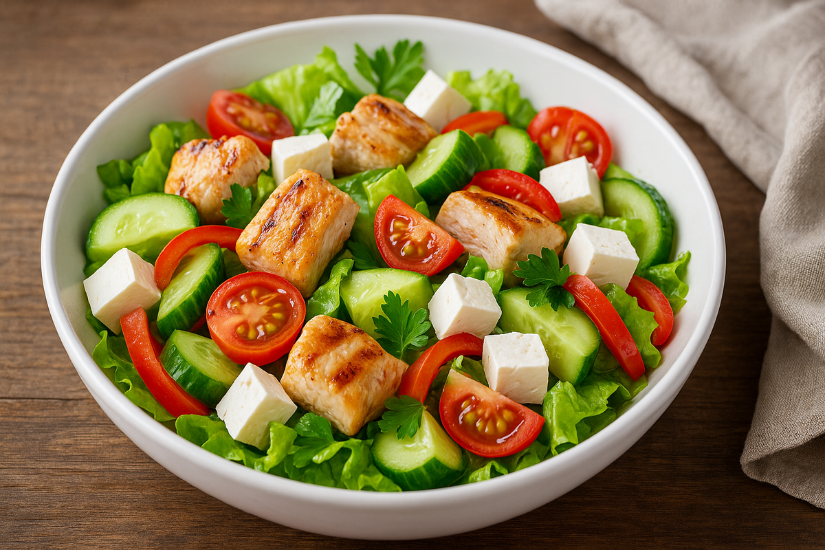 Этот салат — совсем другая история. Он лёгкий, сочный, полезный, и при этом настолько универсальный, что можно менять ингредиенты под настроение. И что самое приятное — он никогда не приедается. 🛒 Что нам нужно (на 2 порции) Куриное филе — 200 г 🍗 Листья салата — 150 г 🌿 Огурцы — 2 шт. 🥒 Помидоры черри — 8–10 шт. 🍅 Болгарский перец — 1 шт. 🫑 Сыр фета или брынза — 100 г 🧀 Оливковое масло — 2 ст. ложки 🫒 Лимонный сок — 1 ст. ложка 🍋 Соль, перец — по вкусу 💡 Если нет курицы — возьмите креветки, индейку или консервированный тунец. Тоже будет вкусно! 🔥 Готовим без спешки и суеты 1. Курица.
