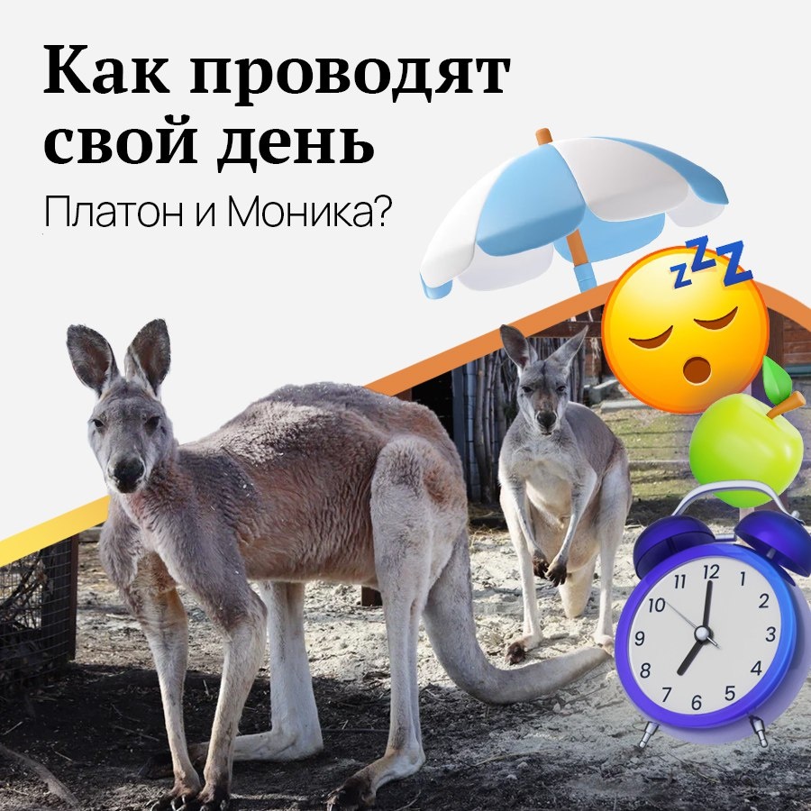 Челябинский зоопарк открывает двери для посетителей в 10 утра, но кенгуру Платон и Моника, подопечные Челябинвестбанка, просыпаются задолго до открытия. Сотрудники зоопарка рассказали, как проходит обычный день у этой семьи кенгуру. 🍽8:00-8:30 — завтрак. К этому времени кенгуру успели проснуться и потянуться. Утренний прием пищи ждут с нетерпением, съедают сразу всё. 🦘8:30-13:00 — личное время. После завтрака у Моники, как правило, активная прогулка. А Платон любит полежать. Если на улице солнечно, то на песке, в пасмурную погоду уходит в домик. Примерно до 13:00 пара занимается своими делами: гуляют, прыгают, щиплют траву, нежатся на солнце. 💤13:00-14:00 — сончас. 🥗15:30-16:00 — второе кормление. Платон к этому времени уже наготове, а Монику нужно персонально приглашать. 🏖16:00 - 22:00 — традиционные послеобеденные ритуалы: Платон спит, Моника гуляет. Теперь до самой ночи кенгуру наслаждаются жизнью: гуляют, лежат, прыгают, играют. Больше новостей и историй про Монику и Пла