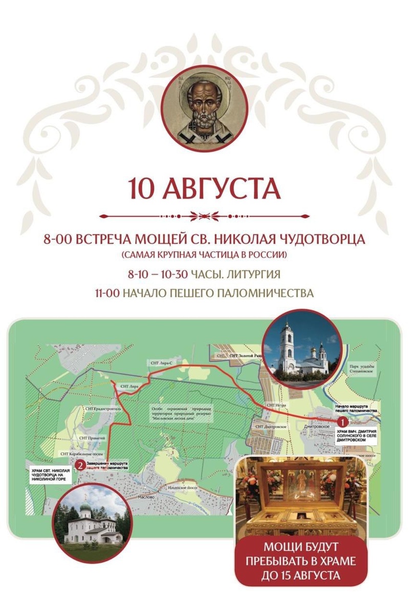 В канун рождества святителя Николая Чудотворца в Подмосковье в село Дмитровское будут принесены мощи свт. Николая Чудотворца и состоится традиционное пешее паломничество. 10 августа, накануне отмечаемого, согласно преданию, рождества святителя Николая, архиепископа Мир Ликийских, в древнем храме в селе Дмитровское, где имеется Никольский придел, перед Литургией состоится значимое для всех верующих событие — принесение самой крупной в России частицы мощей святителя Николая Чудотворца из Воскресенского Новодевичьего женского монастыря (г. Санкт-Петербург). Ковчег передан 22.05.2022 г. в Храме Христа Спасителя Святейшим Патриархом Московским и всея Руси Кириллом в Воскресенский Новодевичий монастырь. В ковчеге хранится часть мощей свт. Николая Чудотворца, сосуд с миром от мощей, сосуд с частью ковчега, в котором мощи переносились из Мир Ликийских в Бари. По окончании Литургии всех участников ждет чаепитие с выпечкой во внутреннем дворе Подворья и рассказ об истории храма. После чего,