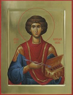 Страстоте́рпче святы́й и целе́бниче Пантелеи́моне,/ моли́ Ми́лостиваго Бо́га,/ да прегреше́ний оставле́ние// пода́ст душа́м на́шим