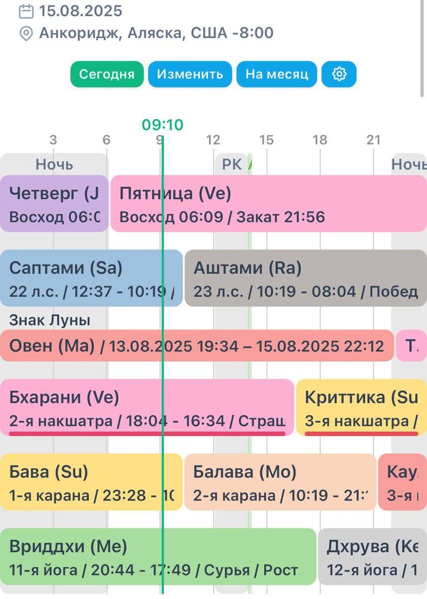 Переговоры на Аляске Переговоры Путина и Трампа пройдут 15 августа… на Аляске. Очень неожиданный и, я считаю, креативный выбор места. Из политических обозревателей никто такой выбор предвидеть не смог. Лунный календарь на эту дату в целом нормальный, бывает намного хуже. Что хорошего: 🔸нет ни сожжения, ни планетных войн, ни ретроградности быстрых планет, ни сложных соединений 🔸Соединение мягких планет-гуру Венеры и Юпитера (Венера хозяйка дня) в Близнецах в Пунарвасу будут способствовать более лёгкому диалогу, мудрому восприятию оппонентов и, возможно, повторению события 🔸Венера, Юпитер и Раху в Пушкара навамше. Эти положения принесут удачу 🔸Соотношение планет в панчанге нормальное, не конфликтное, где-то даже хорошее Что мне не нравится: 🔸Луна в Овне в Бхарани. Всё такие эгоцентричность и импульсивность будут присутствовать 🔸Солнце в ганданте Рака. Думаю, это говорит об огромном накопившемся напряжении в делах государственных между РФ и США 🔸Меркурий в мритью бхаге (мёртвом